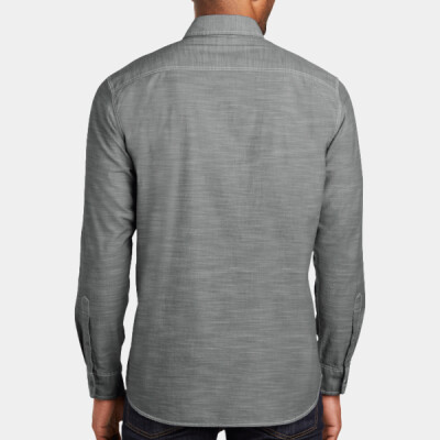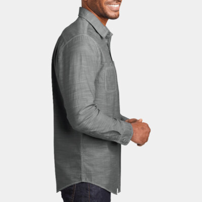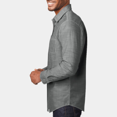 Washed chambray and off-white contrast stitching give this casual garment washed shirt an authentic, laid-back look.
