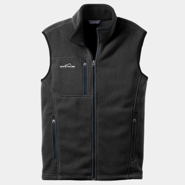 Ward off early morning chills by insulating your core with this soft, cozy vest. Contrast rolled top collar, zippered chest pocket, reverse coil contrast zippers, front zippered pockets with tricot lining, binding at armholes and an open hem. Contrast Eddie Bauer logo embroidered on right chest. Made of 12-ounce, 100% polyester fleece which incorporates Low Impact Technology for enhanced softness and performance.