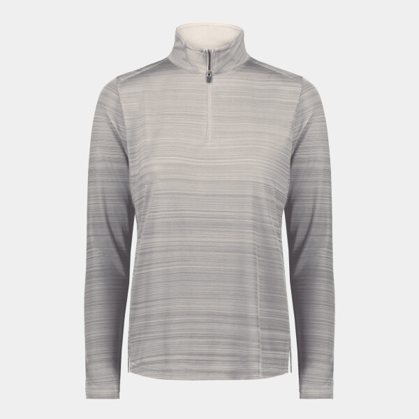 * 100% polyester interlock textured knit with tonal stripe design * Wicks moisture * Ladies' fit * Tag-free label * 1/4 zip pullover style * Cross grain back yoke * Set-in sleeves with rolled forward shoulder seam * Side vents